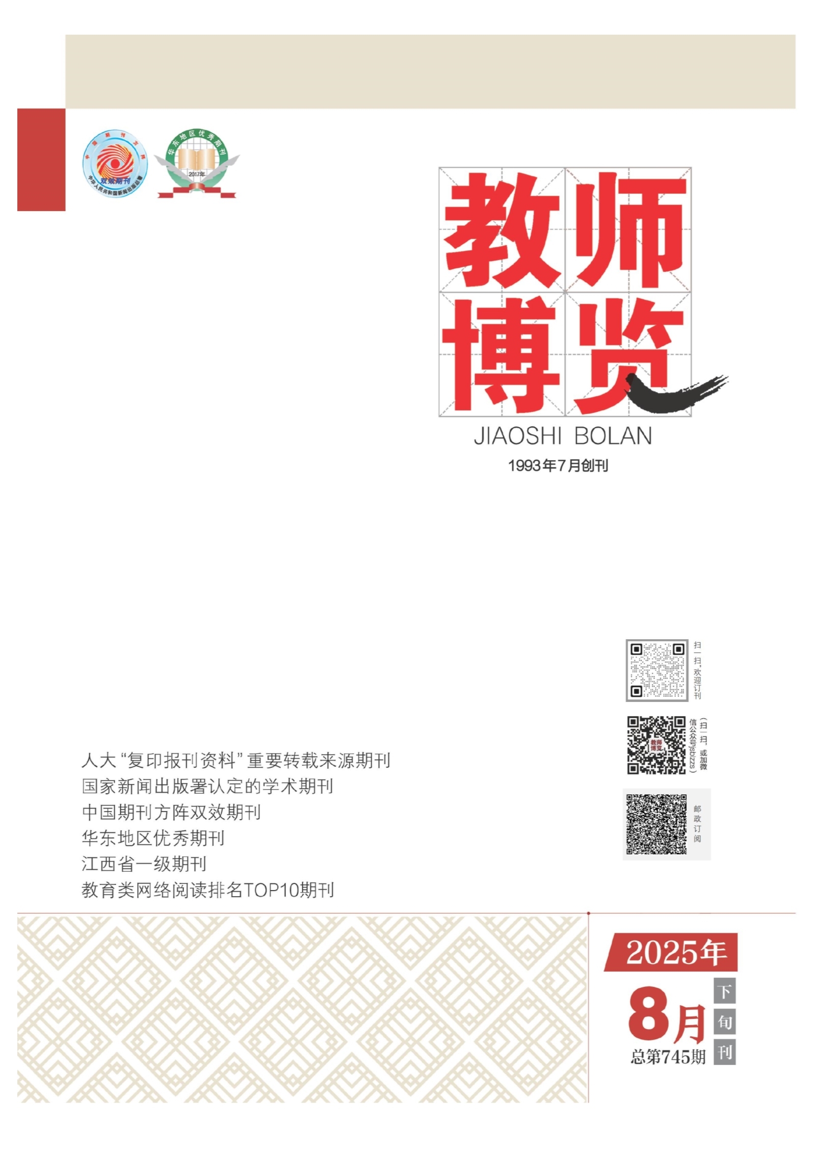 《教师博览》是江西教育厅主管、江西教育期刊社主办的一份面向全国发行的教育杂志,其文摘版创办于1993年,1998年获全国统一刊号,2001年入选“中国期刊方阵双效期刊”,2002年被评为“华东地区优秀期刊”,2004年被评为“江西省优秀期刊”,2010年再次获评“华东地区优秀期刊”“江西省优秀期刊”。 系龙源期刊网“2007年度中文期刊网络传播国内阅读TOP100期刊”(排名第35位)、“2007年度中文期刊网络传播国内分类阅读(教育教学类)TOP10期刊”(排名第1位)。目前《教师博览》杂志共有三个版本:文摘版,2008年增创的原创版,以及2011年增创的科研版。
