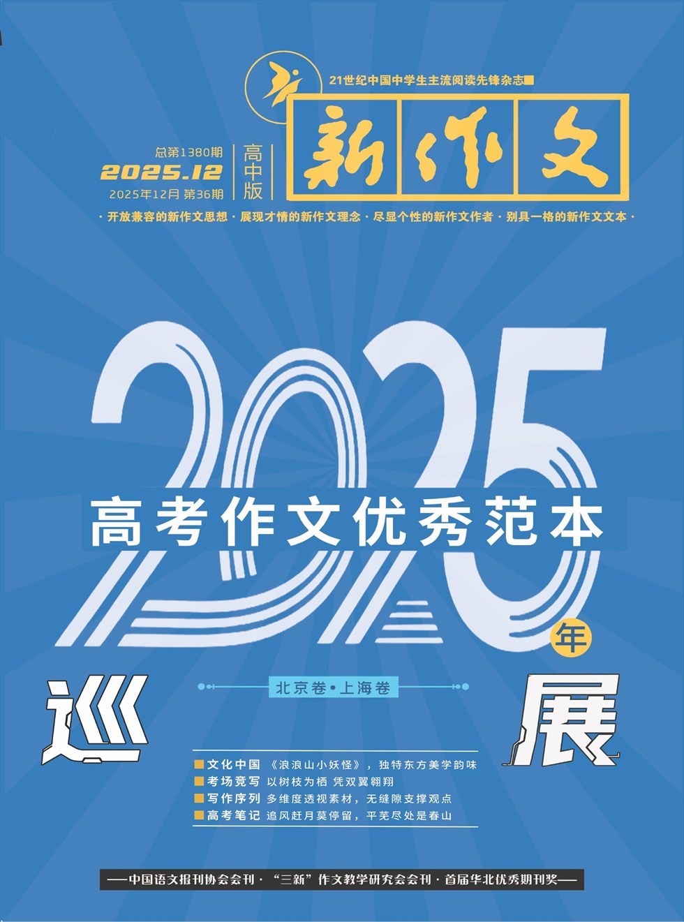 《新作文》,山西出版集团主管主办;第一本采用双色印刷的作文杂志,拥有中国最为完整的作文期刊系列,真正关注作文,值得信赖。《新作文》,一流专家和一流名师,曹文轩,秦文君,张定远,崔峦,曹阳,黄玉峰等等,鼎立加盟铸就优秀品质。《新作文》,以高扬人文作文为己任,倡导“开放兼容的新作文思想,展现才情的新作文理念,尽显个性的新作文作者,别具一格的新作文文本”,备受有关媒体、校园师生和科研单位的关注。《新作文》,富有激情的青年团队,更能倾听来自少年发自内心的呼喊和中国教师的心声,他们将颠覆传统作文刊物鼓噪无味的传统,带来新的飞跃,新的渴望,新的阅读时尚。