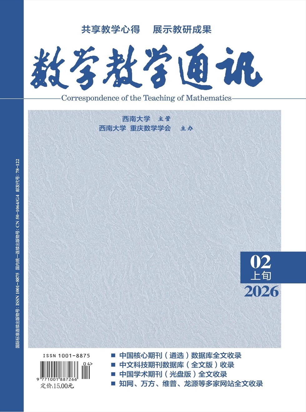 《数学教学通讯》杂志是由西南大学主管,西南大学数学与统计学院与重庆数学学会主办的中学数学教学研究类期刊,创刊于1979年。近30年坚持为中学数学教学服务的办刊宗旨:坚持与时俱进,始终站在数学教育研究的前沿;坚持贴近教学实际,贴近读者要求,为读者提供实用、优质的教学研究平台与资源。本刊以“贴近课改、服务教学、共同成长”为办刊宗旨,探讨新课程下的教学改革、教育实践,着力打造集实用性、知识性于一体的数学核心期刊。