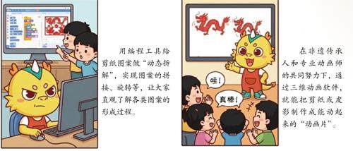 刚研究完剪纸材料和工具的小酷龙,听到自己的龙角突然发出了清脆的声音:“非遗传播新任务开启!请前往韩靖剪纸工作室,解锁更多剪纸技艺的奥秘。” 接到新任务的小酷龙赶紧添加韩老师为微信好友。通过朋友圈,他看到不少韩老师和各国友人手拿剪纸的合影。作为国际剪纸交流活动家,韩老师带着剪刀和剪纸作品走遍了世界各地。 看到这些有趣的照片,小酷龙十分感慨,原来剪纸的魔力这么大,大到足以让全世界的人们都喜欢上它。