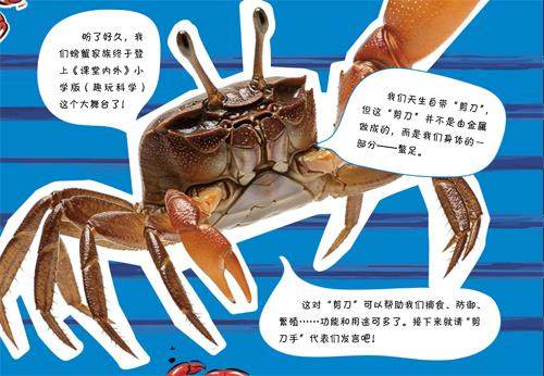 除了剪东西,剪刀还能怎么用呢?小酷龙陷入了思考。没过多久,他听见门口一阵“咚咚”声,原来一群“剪刀手”匆匆赶来,想要为他演示“剪刀”的“花式用法”。 “绒毛剪刀手”:中华绒螯蟹 别名:大闸蟹 分类:弓蟹科绒螯蟹属 分布:我国淡水流域,以及黄海、东海入海口的泥质岸边 这一对“剪刀”粗壮有力,既能剪碎小鱼、小虾等食物,又能挖土打洞。等我们长大,“剪刀”表面会裹满细密的绒毛,像戴了副“露指手套
