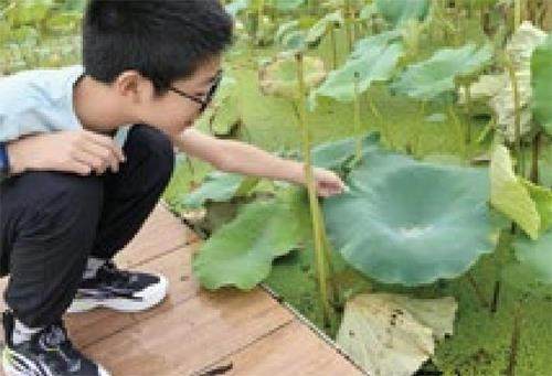 夏日午后,骤雨忽至,我在天仙湖旁的亭子下躲雨。雨停后,我惊奇地发现,湖中荷叶的表面干爽洁净,水珠滚过之处连灰尘都被带走了。 这一现象引发了我的思考:为什么荷叶能“出淤泥而不染”?它究竟有什么特殊的“超能力”? 实验材料和工具 新鲜荷叶、滴管、清水、墨水(模拟污水)、粉笔灰(模拟灰尘)。 实验过程 用滴管在荷叶的表面滴上水,轻轻晃动荷叶,我发现水珠在荷叶表面能够轻松地滚动,并且迅速聚集成球